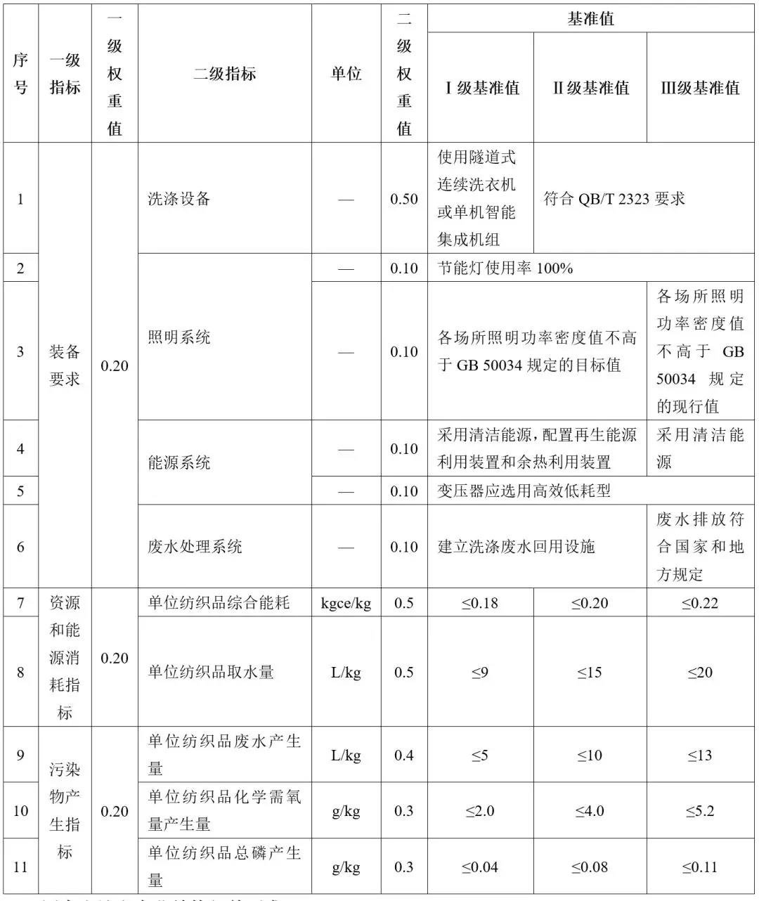 國家發改委、生態環境部、商務部于2018年12月29日頒布實施了《洗染業清潔生產評價指標體系》(國家發改委 生態環境部 商務部 公告 2018年 第85號)。《指標體系》適用于洗染企業的清潔生產審核、清潔生產潛力與機會的判斷以及清潔生產績效評定和清潔生產績效公告制度,也適用于環境影響評價、排污許可證管理、環保領跑者等環境管理制度。以公用紡織品為例,《指標體系》部分內容如下表所示。